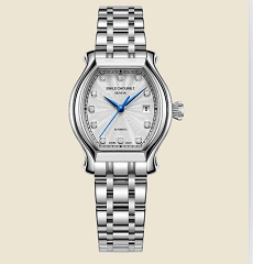 艾米龍?當(dāng)代奢華系列 19.1136.L.6.6.27.6 腕表采用白色油壓表盤,其獨(dú)特的油壓工藝賦予表盤細(xì)膩而柔和的質(zhì)感,在光線的映照下,呈現(xiàn)出一種低調(diào)而奢華的光澤。表盤上的鉆石時(shí)標(biāo)更是點(diǎn)睛之筆,顆顆鉆石精心鑲嵌,璀璨奪目,與白色表盤相互映襯,營(yíng)造出高貴典雅的視覺效果,讓每一次時(shí)間的讀取都成為一種享受。