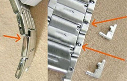 根據(jù)需要拆除的表帶節(jié)數(shù),使用工具將多余的表帶節(jié)拆下。對(duì)于金屬表帶,可以使用頂針或生耳批將插銷(xiāo)推出。對(duì)于實(shí)心表帶,可以擰松拆帶器把手,將表帶放入表槽,保持鋼針對(duì)準(zhǔn)針孔,再用鉗子拔出生耳。